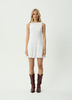 Focus June in our lightweight, textured stretch seersucker fabrication made from hemp and tencel. This mini dress is designed with a skimming fit, high neckline, subtle scooped back, gathered drop waist skirt, and princess panels. Together, these details create a soft, refined silhouette.