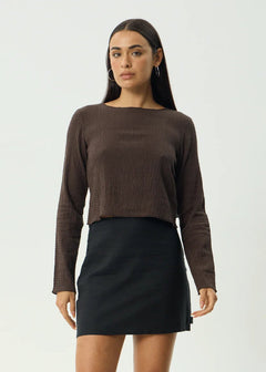 The Focus Long Sleeve Top is designed with a relaxed fit and a refined boat neckline. Subtle flared sleeves and a baby-locked raw edge finish add delicate detail, while the textured stretch seersucker offers a lightweight, breathable feel. Crafted from a hemp and tencel blend for a soft yet structured finish.