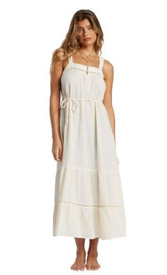 - Button detail at front neck, lace trim throughout garment, tiered skirt, removable belt at waist
