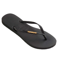 Havaianas Slim Metal Black/Gold Thongs. Add some bling to your step this summer with our slim metal logo styles. Classic colour-blocked black slim Havaianas with matching slim gold Havaianas straps featuring a sleek gold Havaianas metal logo. Comfortable rubber thongs that say Ka-ching!