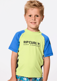 The performance-fit Shock UPF Short Sleeve Rash Vest offers sun protection, chlorine-friendly durability, and a comfortable elastic boardshort loop. Heat transfer prints keep it stylish for every surf session.