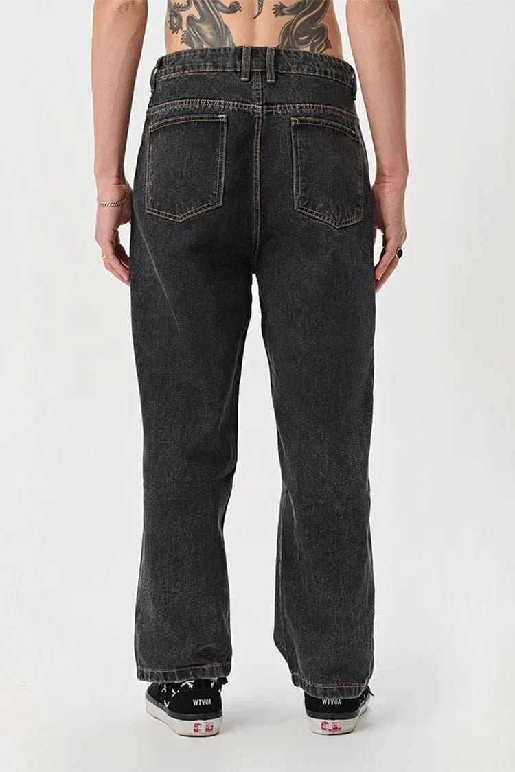 The Bull Denim 91 Pant in Washed Black is a fixed waist pant with belt loops that follows the wide fit of the classic 91 pant. Featuring five pockets and a zip fly. Made from 100% Cotton Bull Denim.