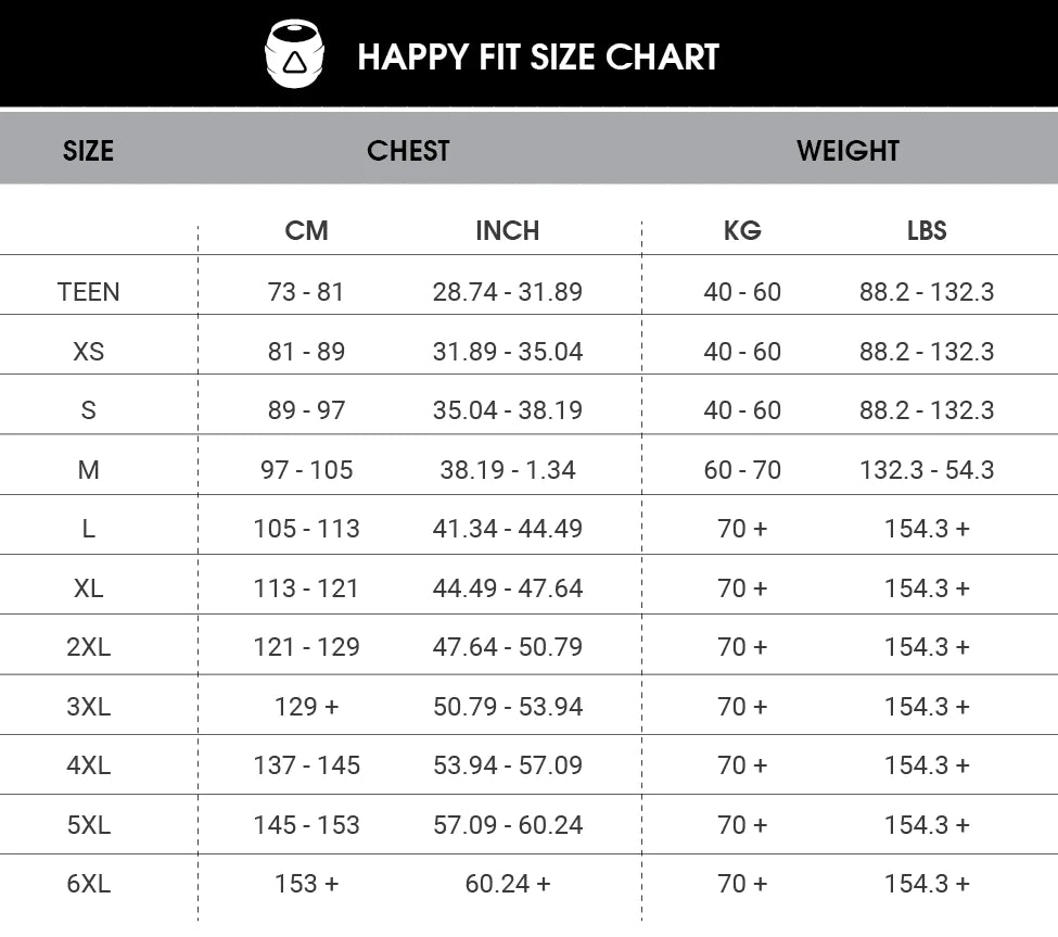 XS, S, M, L, XL, 2XL, 3XL