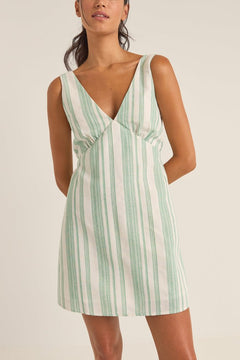 Capture coastal living with the Dinero Stripe Mini Dress by Rhythm. This beach-inspired piece boasts wide shoulder straps and a deep V neckline for a breezy and sun-kissed look. The adjustable back tie ensures a personalized fit, while gathers at the under-bust add a touch of playful charm. Embrace laid-back elegance with this coastal lifestyle dress, perfect for carefree days by the sea.