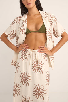 This Brown Seafarer Short Sleeve Shirt, made from a soft rayon-ramie blend, is a tribute to nautical ease. With a relaxed, boxy fit and a Cuban collar, it features a large-scale print that evokes the sprawling sea. Buttoned up or down, it's designed for those drawn to evenings overlooked by a warm horizon.
