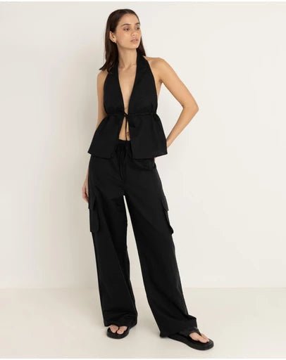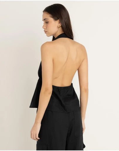 The Rhythm Cove Halter Top combines a linen-cotton blend for breathable comfort with a deep halter neckline and sleeveless design, offering a stylish yet relaxed fit. Its front tie detail adds a touch of effortless sophistication, making it ideal for those who value creative self-expression through their wardrobe.