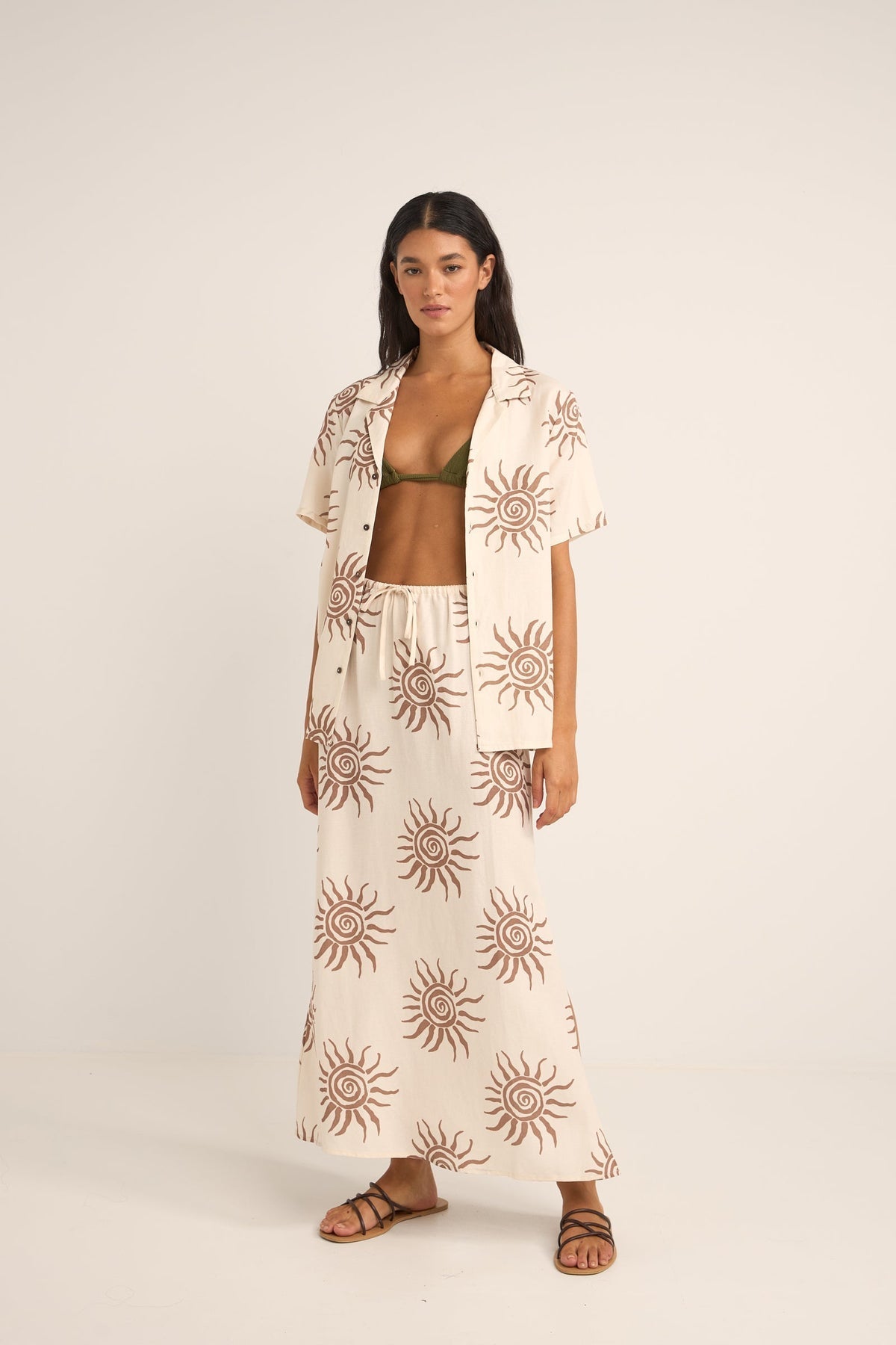 This Brown Seafarer Short Sleeve Shirt, made from a soft rayon-ramie blend, is a tribute to nautical ease. With a relaxed, boxy fit and a Cuban collar, it features a large-scale print that evokes the sprawling sea. Buttoned up or down, it's designed for those drawn to evenings overlooked by a warm horizon.